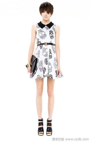 彼得潘小翻领涂上浓重的黑色,复古的味道也便随着它的深厚而变得浓郁起来。不过这份复古仅停留在衣领部分便戛然中止,迎接它的,是充满时尚潮流气息的骷髅印花,风格的强烈撞击,引爆眼球就在顷刻间。