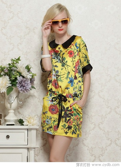 06 用抽绳约束印花的夸张。均码女生最喜欢用印花演绎时尚、甜美、俏皮或邻家女生小清新,而大码女生却不适合东施效颦,但属于大码女生的印花也有着均码女生可望而不可及的名媛休闲,娃娃领与中长袖用于演绎柔美,在这里都不是主角,真正主角却是腰间那条撞色抽带,以及由它抽系出的腰线比例,有收有放,印花浪漫好休闲。