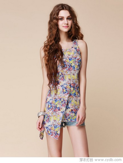 03 长过臀部的中长款雪纺衫拥有连衣裙式的唯美裙摆,与热裤搭配性感至极。腰臀曲线在黄红蓝的印花绚烂中被隐藏,视线总是流连于匀称的双腿。单侧长裙摆起到引导视线的作用,亦利于营造层次。