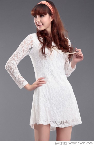 04 你是黑色的深沉内敛,我则是白色的纯洁无暇,繁复精致的蕾丝花布满了裙身,从领口蔓延到裙角,轻轻包覆在手臂上,装点了我的梦。腰部的修身剪裁很显身材,搭配简单的项链展现清纯的美丽。
