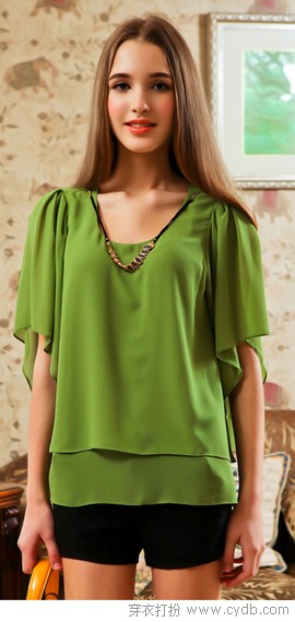 06 薄荷糖一样清新的绿色在夏天穿最应景不过了。领口的项链是款式自带的,有了它的点缀整件衣服都变得高雅耐看起来。花苞型的肩头设计使袖子看起来倍显飘逸。双层下摆也贴心地遮掩住了腰腹间的肉肉。