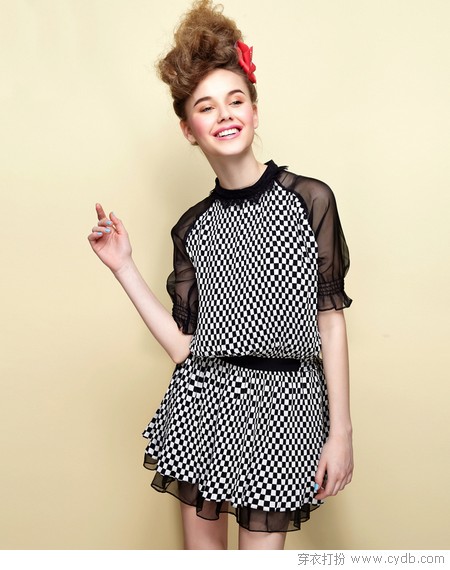 02 精致的花瓣边堆叠成唯美的领口,延伸下去的袖子用透明网纱打造,薄透却不露,一点点的小诱惑适合想要尝试性感风格但内心保守的女孩。黑白色的小块方格充满了古典韵味,英伦风尚的典范,宽松的版型在腰部设计了松紧,修饰身形。