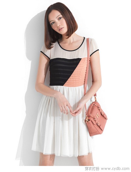 07 在上半身运用几何图形撞色拼接巧妙打造大牌效果,让腰部显苗条,也避免了胸部走光。精致的褶皱使下摆更具甜美女人味,纯白色调很善于表达女性行走间的飘逸,让整体素雅中见大美。